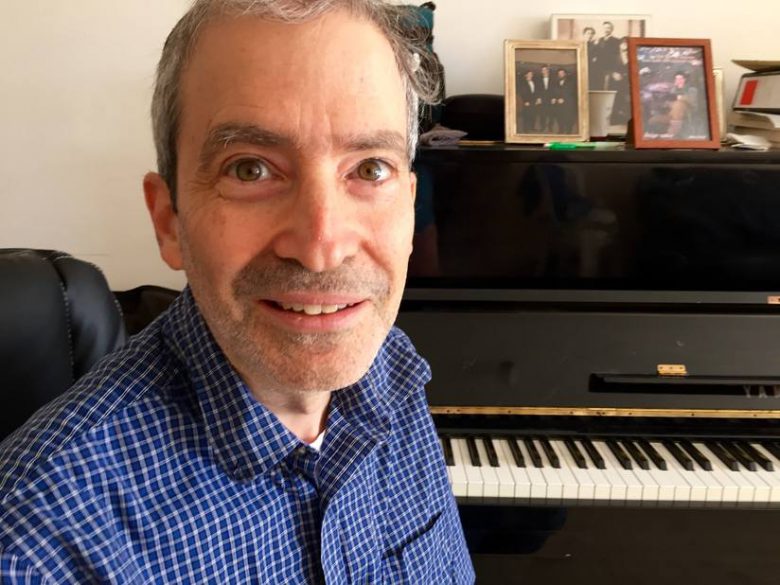 Vestido en bata de hospital, un paciente en silla de ruedas que padeció de cáncer de linfoma, se acerca al gran piano del Centro Médico Hadassah en la Torre del…