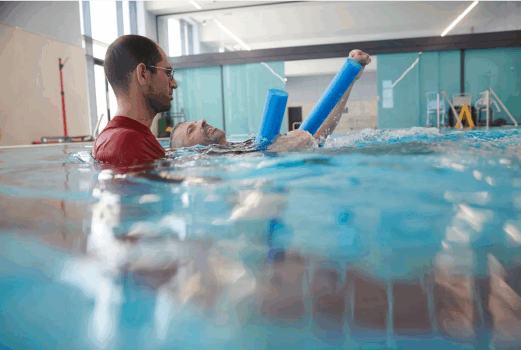 El Centro de Hidroterapia de vanguardia consta de dos piscinas y funciona como un gran gimnasio acuático con capacidad para tratar a más de 150 pacientes al día mediante una combinación de terapia individual y grupal. La piscina más grande tiene agua fría y se utiliza para tratar lesiones agudas e inflamación, mientras que el agua tibia de la piscina más pequeña es más eficaz para tratar el dolor crónico y la rigidez. En ambos casos, la flotabilidad natural del agua proporciona apoyo a los pacientes mientras recuperan fuerza, equilibrio y flexibilidad.